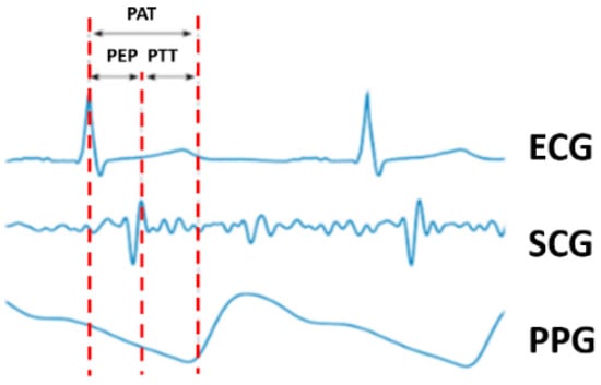 Pulse arrival time (PAT) has also been recognized as having a strong correlation with blood pressure. The definition of PAT specifies the time elapsed between an ECG signal from the chest and the peak from the PPG signal measured at a second site. In other words, this time delay is the sum of the pulse ejection period (PEP) and PTT. The PEP is obtained from the ECG and SCG. PAT is inversely proportional to blood pressure, thus providing a method to measure blood pressure. Alternatively, PTT-based blood pressure measurements that have also been explored have set the PEP, which is the period from ventricular depolarization to ventricular ejection, as a constant value [19,20]. However, another study reported that PEP could vary due to breathing variations and premature contraction of the heart muscle [21]. Hence, a PTT-based method offers a better solution as it does not include the PEP delay. Figure 1 depicts the relationship between these variables. Notably, although some previous studies have used PAT and PTT without any alteration, such approaches were incorrect as the two phenomena represent different delays.