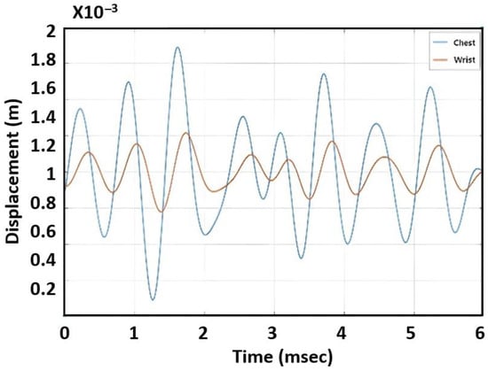 Figure 4 shows displacement variations for a subject’s chest and wrist measured by radar. Because the blood pulse traveled from the chest to the wrist, it was observed that the phase of the chest signal led the one recorded from the wrist. The PTT was found by calculating the time delay between the two waveforms. In this measurement, PTT was around 210 ms. By comparison to PPG sensors that can obtain detailed systolic and diastolic peaks [6,7], our data from using radar only show the systolic peak while the diastolic phase could not be measured accurately.