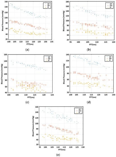 The relationship between blood pressure and PTT, (a) subject 1, (b) subject 2, (c) subject 3, (d) subject 4, and (e) subject 5.