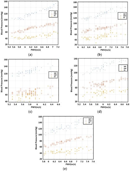 The relationship between blood pressure and PWV, (a) subject 1, (b) subject 2, (c) subject 3, (d) subject 4, and (e) subject 5.