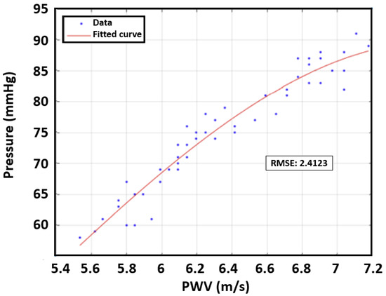 In the next step, we evaluated the error for each case. Polynomial curve fitting was obtained by using MATLAB to determine the best polynomial regression model. The root mean square error (RMSE) was used to evaluate this case as it quantified the error between the model and measured data. The third-order polynomial was found to provide the best RMSE results for the preliminary data. Figure 7 presents an example of DBP depending on PWV with curve fitting results for the first human subject. As seen in Table 3, the PTT revealed the strongest relationship with DBP as the RMSE was 3.69 mmHg.