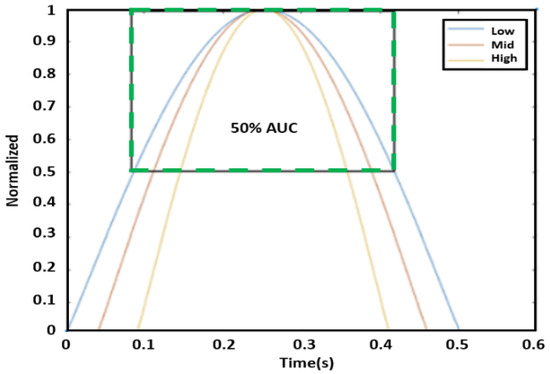 AUC is intended to measure the sharpness of the peak. First, the amplitude of each peak of the displacement graph was normalized to the unit level because the peaks of the phase graph varied. After normalizing amplitude to one, we defined AUC as the area bounded by the graph itself and a line of 50% of the peak (i.e., 0.5), as shown in the green box of Figure 8. Three peaks from the 10 s data were selected to find an average AUC value for each reading. In particular, the three highest peaks were extracted for this process. Figure 9 illustrates the correlation between blood pressure and AUC. The experimental results uncovered a strong correlation between blood pressure readings and AUC at half amplitude. Furthermore, on average, AUC measurements provided a closer correlation with SBP compared to PTT.