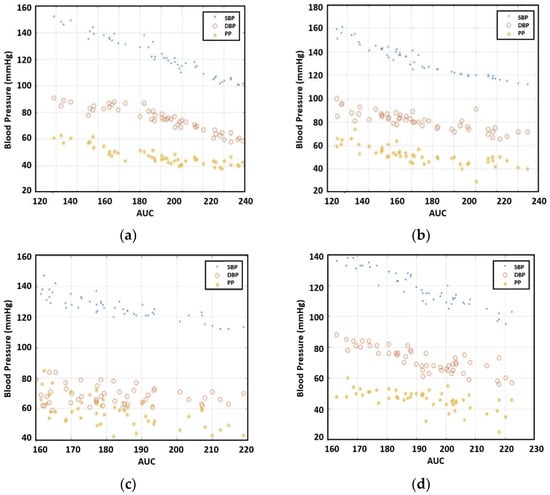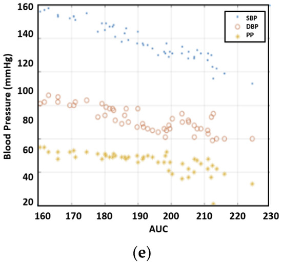 Individuals’ AUC vs. blood pressure, (a) subject 1, (b) subject 2, (c) subject 3, (d) subject 4, and (e) subject 5.