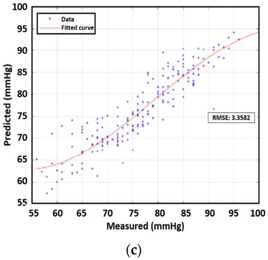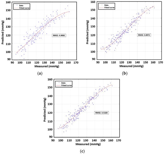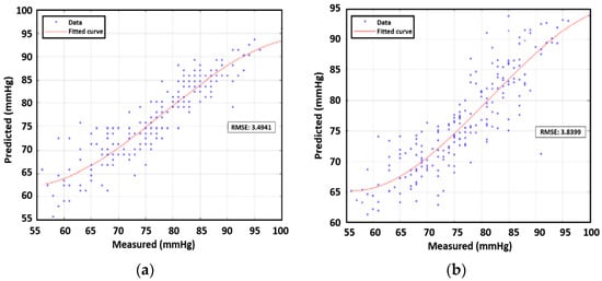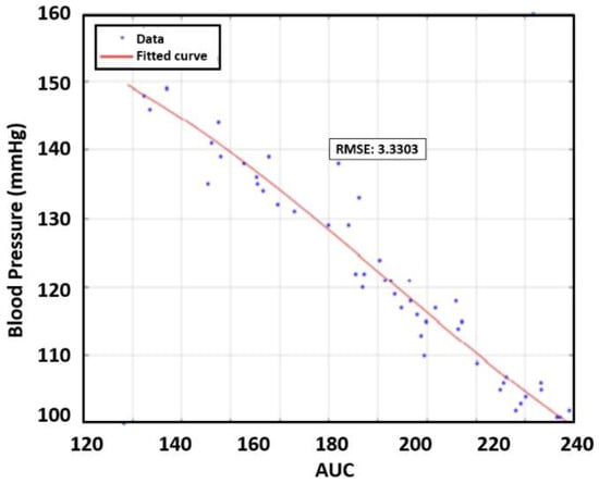 To evaluate the AUC, we introduced a regression model that found the best fit to the data to determine the RMSE as presented in Figure 10. As can be seen in Table 4, the AUC displayed the strongest relationship with SBP. In contrast to the average RMSE value for PTT versus DBP, which was 3.69, the value for AUC versus SBP was 3.60. Without Individual 3′ data, the RMSE for SBP decreases to 3.49 mmHg.