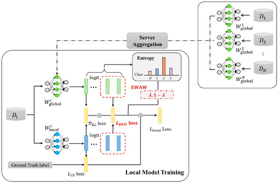 where is a hyperparameter which controls the ratio between the cross-entropy loss and the global distillation loss. It can be set to a high value in the initial training phase to fully utilize the knowledge from the local dataset. As the number of communication rounds increases, exponential decay is applied to to fully exchange the knowledge between the local and global models, enhancing the effects of collaborative training. in the local loss is an adaptive weighting factor, which is used to automatically weigh the proportion of single-sample knowledge and relational knowledge in each batch from the perspective of prediction entropy; the detailed process is described in Section 3.4. The global model in the local side uses the local model to extract single-sample knowledge and relational knowledge in the same proportion so that it can be used in the subsequent round of aggregation.