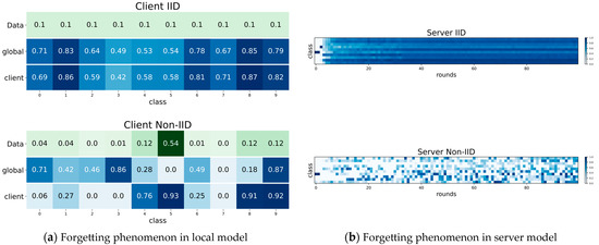 To confirm the conjecture of incoherent learning due to forgetting in federation learning, we first built an image classification system using FedAvg as the federated learning framework. CIFAR10 (see details in Section 4.1.1) was selected as the dataset and it was classified into IID and Non-IID scenarios using the Dirichlet distribution. We trained the FedAvg for 20 communication rounds (avoiding the initial and ending training phases) and then verified its per-class accuracy. After that, we analyzed the per-class accuracy change of one client by training local models for a certain epoch. As shown in Figure 3a, the accuracy of the client model after local training in the Non-IID scenario is increased on certain classes which has more private data. However, the accuracy on the rest of classes is much smaller than the accuracy of global model it just received, implying that it forgot the received global knowledge. On the contrary, in the IID scenario, the global knowledge is preserved due to the homogeneous data distribution.