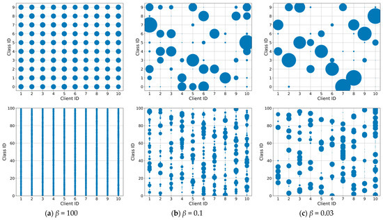 . A smaller indicates a greater degree of data heterogeneity, following some similar approaches [33,39]. We divide the Dirichlet division into 10 clients and simulate scenarios with IID and different degrees of Non-IID by choosing 100, 0.1 and 0.03 for , which covers IID, normal Non-IID and extreme Non-IID scenarios. When beta is 100, each client has almost the same number of data classes, which simulates data homogeneity. When is 0.03, however, it indicates that each client has almost only roughly two classes of data (using the CIFAR10 dataset). The relevant divisions are shown in Figure 4.
