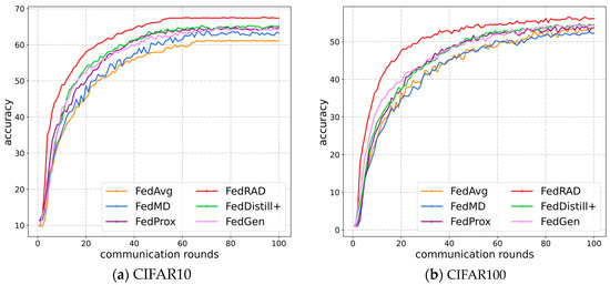 In order to evaluate the adaptability of FedRAD, experiments are conducted on CIFAR10 for different numbers of clients participating in each communication round. Specifically, the training data of CIFAR10 are assigned to 100 customers, and the proportion of active clients is chosen as (0.1,0.2,0.3,0.4). Table 4 shows the test accuracy for each method with different proportions of active clients . Figure 6c shows the test accuracy on different . It can be seen in the figure that FedRAD achieves the best performance in each case. Additionally, when more clients participate in each communication round, each method’s performance improves.