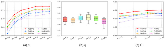 In order to assess the robustness of FedRAD under different degrees of data heterogeneity, the accuracy of different methods is tested under different Non-IID scenarios (adjusting for the hyperparameters of the Dirichlet distribution ). Figure 6a and Table 3 show the test accuracy of each federated learning method under different in the CIFAR10 dataset. FedRAD achieves the best performance in various Non-IID distribution scenarios, outperforming other baselines. As the degree of data heterogeneity decreases (i.e., increases), the accuracy of all methods tends to increase. FedProx performs similarly to FedAvg in some heterogeneous scenarios; one reason is that it simply imposes a regularization constraint on the local model based on the global model weights, rather than optimizing the local model with more specific constraints from a knowledge distillation perspective. It is also noted that FedRAD improves more than other methods in scenarios where the data are more heterogeneous, while FedMD does not improve significantly in this case, further validating the need for collaborative distillation to mine high-dimensional relational knowledge in the absence of single-sample knowledge. FedDistill+ aggregates the client model parameters and performs one-sample knowledge distillation for the global model, but it is also weaker than FedRAD in different distribution scenarios, which further illustrates the need for relational knowledge distillation in a Non-IID environment. FedGen’s performance in different Non-IID scenarios depends on the inductive bias it conveys to the clients, and the effect often depends on the quality of the feature space provided by the generator.