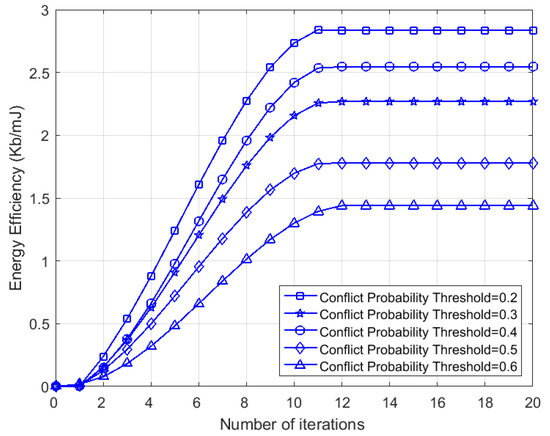 Figure 5 depicts the evolution of the energy efficiency with the number of iterations under the conflict probability threshold