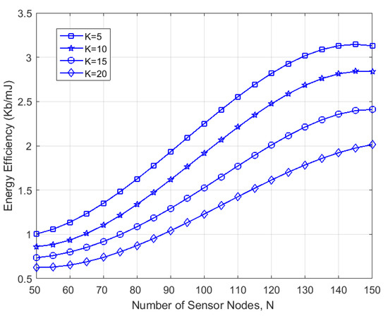 N increased further, the increase in energy efficiency became slower and eventually stabilized. This was mainly due to the shortening of the transmission distance, which caused more collision delays and the energy consumption of control messages. Also, it can be observed that the energy efficiency was inversely proportional to