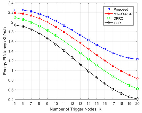 higher than the MACO-QCR. Clearly, the TOR had the lowest energy efficiency, which is due to the absence of a power control mechanism, thus resulting in unnecessary energy consumption. The DPRC and MACO-QCR utilize power control to lower the energy consumption of the network, and the MACO-QCR further trades off energy consumption and throughput in its routing design. Both algorithms are effective in improving the energy efficiency of the network to a certain extent; however, they do not take into account the problem of interference collisions between nodes. As the number of trigger events increases, collisions between relay nodes not only introduce more energy consumption in control messages, but also reduce transmission concurrency, thus resulting in throughput degradation. Conversely, our algorithm maximized energy efficiency under the constraint of minimizing collision probability, which can effectively improve energy efficiency while accommodating interference collisions in multi-path transmission.