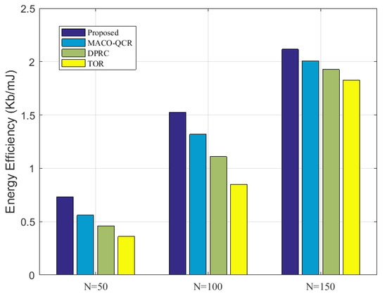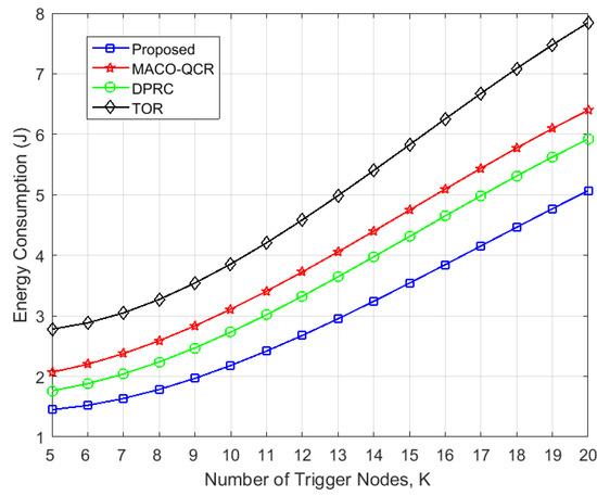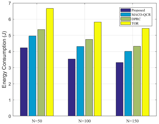 Figure 7. It can be observed that our algorithm had the lowest energy consumption, followed by the DPRC, the MACO-QCR, and the TOR. Specifically, the energy consumption of our algorithm was reduced by