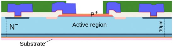 15]. After the lithography to define the metal layer, a thick polyamide layer is deposited for the passivation, and a further lithography is performed for the opening of the detector active area. Finally, the substrate is reduced from the backside by a mechanical process until a final thickness of the epitaxial layer plus the substrate of 110 μm, and the ohmic contact is formed by a titanium/nickel/gold deposited on the back of the wafer.