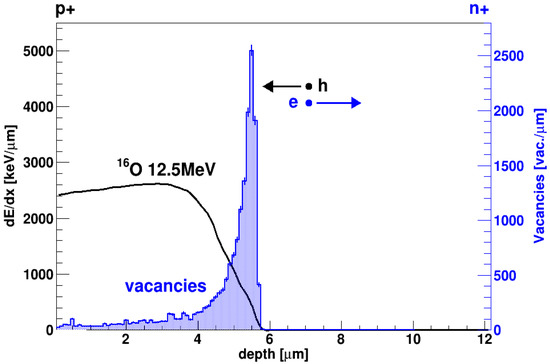 16O ions in SiC is 5.6 µm, it is clear from the picture that most damage is produced at the very end of the ion range. The specific energy loss due to collisions with electrons is also reported (Bragg curve): the linear density of the electron-hole pairs produced by the ion is proportional to this value. After the ionization track is produced, electrons drift to the right, towards the n+ electrode; conversely, holes drift to the left, towards the p+ electrode. It is thus clear that electrons have to pass through the most damaged region in order to reach their collection electrode, after which they go through a relatively undamaged region. Holes, on the other end, drift all along the damaged region, though only part of them go through the most damaged zone.