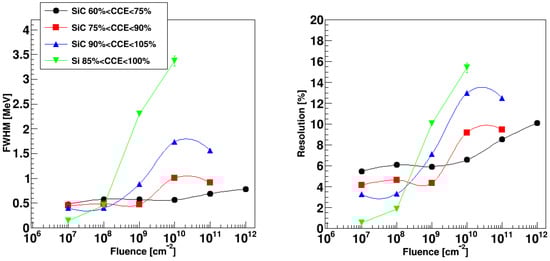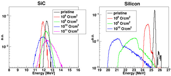 32], a spectroscopy amplifier (Mesytec Corporation mod. MSCF-16-F, Putzbrunn, Germany), set to 2 µs shaping time and a Silena 4418/V peak sensing ADC. The much larger capacitance of the SiC detector is associated with a larger electronic noise contribution to its energy resolution, with respect to the p-i-n silicon. However, electronic noise is not the dominant contribution to the energy resolution in our case.