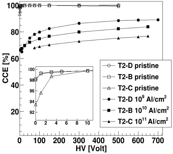 It is important to notice that, in this experiment, the Charge Collection Efficiency (CCE) is studied with the same ions producing the damage.