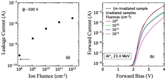 Figure 11b, the obtained results are reported. The unirradiated diode exhibits the typical behavior of a p-n junction, showing a turn-on voltage of about 1.8 V, an exponential increase of current with bias at low voltage and a linear increase at higher voltages (>2.5 V) due to presence of the series resistance [