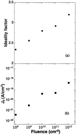 2 in the highest fluence irradiated device. From Equation (2), we deduce that the change in J