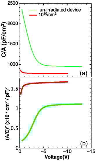 Figure 13a): The capacitance decreases, and a different trend was observed at a lower bias (2.0 V) with respect to unirradiated diode (4.0 V), indicating that for this bias all the n-type layer is already depleted. The carrier concentration calculated from the corresponding (A/C)