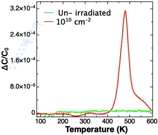 The spectrum of unirradiated diode does not show any peaks, indicating the low concentration of processing defects. A main peak at 480 K with a broad band appears in the DLTS spectrum after irradiation at 1.0 × 10
