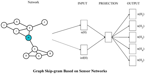 The framework of the Graph Skip-gram. The Graph Skip-gram predicts surrounding nodes given the current node. The graph structure information around node H is extracted on the graph as inf(H), in sensor networks is available by reading node information, inf(H), and node H as inputs to the model, and the output is the prediction of node H on the surrounding nodes H.