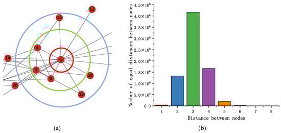 As shown in Figure 2a, nodes located at the center of the network (node 1) have more links relative to the edge nodes of the network (nodes 13, 18, 22, 12). We wish to capture this relationship through the difference in node degree and improve the quality of node embedding. Let and be the degrees of node u and node n. We usually define , increase the co-occurrence probability of nodes at different levels of the network and, thus, reduce the intra-class spacing. We define that the co-occurrence probability between two nodes increases with decreasing node spacing, and the value of p is determined by the distance distribution between nodes.