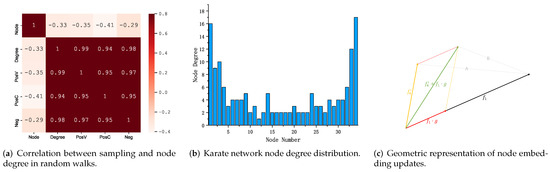 In this section, we use DeepWalk to learn the node features of the Karate network. We refer to the word2vec and DeepWalk code implementations given in [2,56] to give a simplified graph embedding pseudo-code implementation, Algorithms 2 and 3. Referring to the paper [18], we set embedding dimension , windows size , walks per node , walk length , and negative sampling for training.