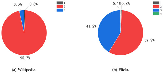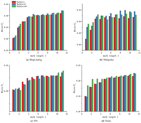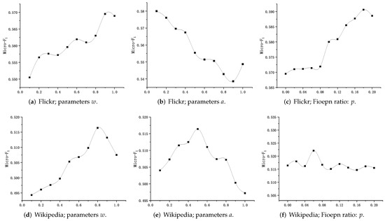 Figure 9 shows the sensitivity of the parameters based on the Flickr and Wikipedia datasets. Figure 9a,d show the effect of the parameter w on the Micro-F score, and both datasets’ optimal w values exist. Referring to Equation (7) demonstrates that adjusting the co-occurrence probability of nodes at different levels can improve the quality of node embedding. The problem of uneven distribution of P matrix data items in Figure 8a can be alleviated by adjusting the parameter a, as shown in Figure 9e, obtaining the best performance when . Figure 9f shows the performance obtained by adjusting the node vector fusion rate in the Wikipedia dataset fluctuates as the fusion rate changes. Figure 9c shows how the value of p affects the performance; a 2% performance improvement can be gained by properly setting the parameter p, demonstrating the effectiveness of the Fioepn algorithm in optimizing node embedding.