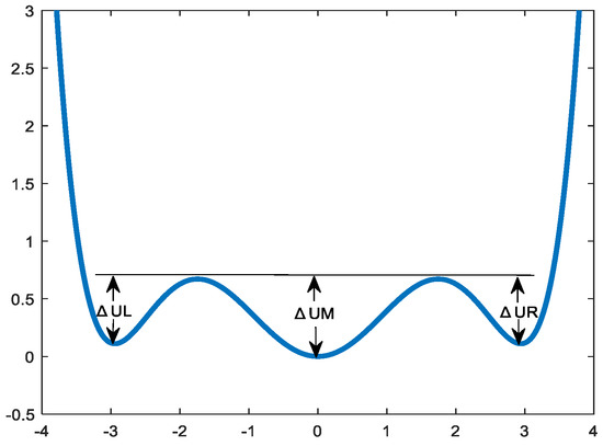 In the formula, , , and are parameters of the nonlinear multistable model, and they are all greater than 0. The potential function model image of the multistable system is displayed in Figure 1.