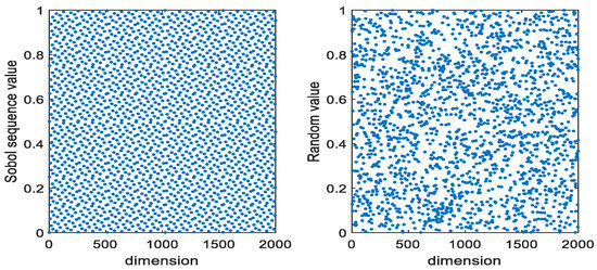 The distribution of individuals with the same population size in the same dimensional space is shown in Figure 2. From Figure 2, it can be seen that the distribution of the population initialized using the Sobol sequence is more uniform than that generated randomly, which enables the population to traverse the entire search space better.