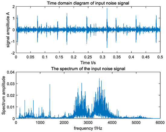 The vibration signal of the motor collected by the vibration sensor is shown in Figure 15. As can be seen from Figure 15, the time domain signal of the actual motor fault collected by the vibration sensor is very weak, completely submerged in the noise, and the frequency domain signal cannot distinguish the fault frequency. The method proposed in this paper was used to detect the fault frequency of the crystal rotating motor, and the test results are shown in Figure 16. It can be seen from Figure 16 that the algorithm increased the frequency domain amplitude of the fault signal and effectively detected that the fault frequency of the crystal motor was 35 Hz.