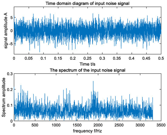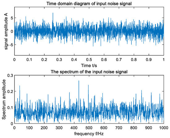 In an effort to verify the applicability of the raised method in actual fault-signal detection, the open bearing-fault data set of CWRU was selected for the experiment [40], and the driving end bearing model 6205-2RS was used. Since the rotating speed of the bearing was 1750 rpm, the fault characteristic frequency of the inner ring was calculated to be 158 Hz. In the experiment, the sampling frequency was set to 12 kHz, and the data length of the signal was 12,000. The time domain and frequency domain waveforms of the input signal are shown in Figure 9, and the output signal-to-noise ratio was . As can be seen from Figure 9, the fault frequency of the original signal was difficult to capture in its frequency domain due to the influence of environmental noise. In order to ensure the accuracy of the experimental results, the average method of 30 experiments was adopted. The optimal parameters optimized by MSGWO were as follows: , , , and . We substituted the four parameters , , , and into the SR system to obtain the frequency domain waveform of its output, as shown in Figure 10. The output signal-to-noise ratio was , which was 10.85 dB higher than that of the input. According to the frequency domain waveform diagram in Figure 10, it can be observed that there was a clear spike at the target frequency, and the amplitude of the peak frequency was much larger than the amplitude of other surrounding frequencies. It can be seen that the method in this paper can effectively detect the bearing fault signal.