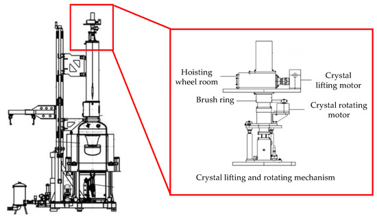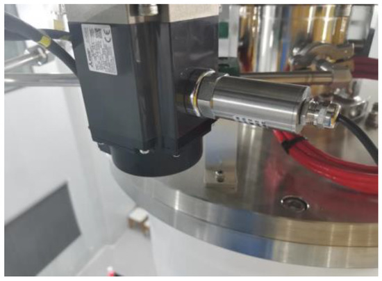 In this paper, the crystal lifting and rotating mechanism of a crystal growing furnace was taken as the actual test object, as shown in Figure 13. The crystal growing furnace is the major equipment for producing wafers. The mechanism is composed of two Mitsubishi HG-KR73 servo motors, the crystal lift motor is used to lift the crystal upward, and the crystal rotating motor is used to drive the crystal to spin during the growth process. Because the stability of crystal rotating is an important factor to determine the crystal formation and crystal quality, it is necessary to accurately monitor the fault of the crystal rotating motor. The experiment object was the motor of a certain type of electronic-grade silicon single-crystal growing furnace. The purpose was to detect the failure frequency of the crystal rotating motor. A certain type of three-dimensional vibration sensor was used in the experiment, and its connection with the motor is shown in Figure 14. As shown in Figure 14, the vibration sensor was adsorbed on the motor, and information such as vibration displacement, vibration speed, and vibration frequency can be collected. The deceleration ratio of the crystal rotating system was 100:1, that is, when the crystal rotating speed was 10 rad/min, the speed of the crystal rotating motor was 1000 rad/min.