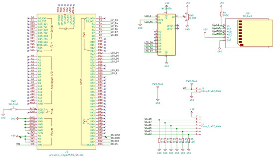 The detonation time measurement equipment consists of an Arduino mega board with an ATmega 2560 microcontroller and a 16 MHz quartz oscillator. The microcontroller has a 256 kB flash memory where the program containing the operating instructions is stored. The board has 54 digital input/output (I/O) terminals, of which a total of six terminals are used for the connection of the measurement circuits. Another six I/O terminals are used to control the liquid crystal display (LCD) that shows system information. Communication with the microSD card for data recording occupies another four I/O terminals. The rest of the digital pins are left free, so the unit could easily be expanded with a larger number of circuits to measure detonation times.