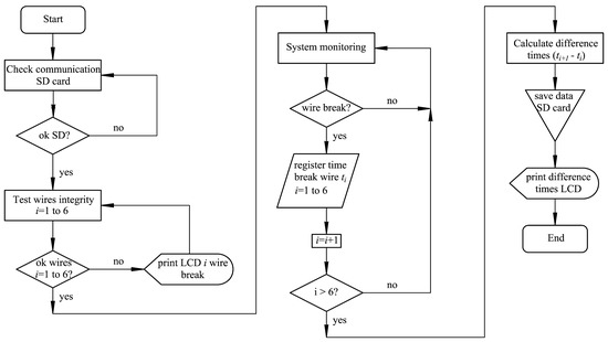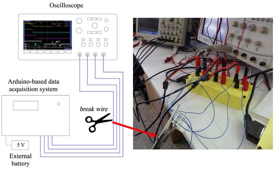 The minimum time that must elapse between two events, cable breaks, to be measured is given by the time it takes the microcontroller to execute the code necessary to record the values. To determine this value, the sketch containing the operating instructions has been started with all the measurement circuits in a low state. Under these conditions, the values recorded using the system are 8 or 12 microseconds, i.e., between two and three times the resolution of the function micros(), which is 4 microseconds. Therefore, events occurring in a time interval of three times the resolution (0.012 ms) or higher will be recorded without problems, which are the potential blasting conditions.
