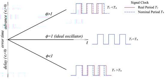 28], called a clock. Since perfect oscillators do not exist, the signal is affected by an error in the period between pulses, with the actual vibration frequency being different from the nominal one. Apart from this tolerance error, inherent in any manufactured component, the oscillator frequency can also be affected by environmental factors, such as temperature or aging [