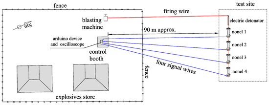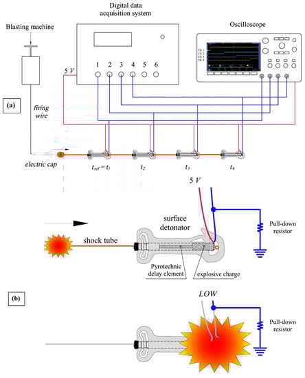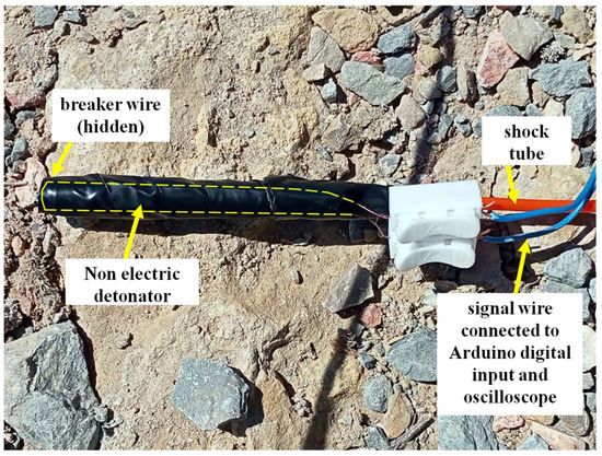 18] to measure detonation times between two connectors or detonators, which may be non-electric. The detonators have to be placed at the same distance from the acoustic sensor to avoid systematic errors in the time taken for the sound wave to reach the sensor. As in the previous case, this system is not applicable to real production blasting, since it requires the same distance between detonators and the sensor. Besides, the acoustic signal may be masked by wind or external noises, among other factors, together with the risk of equipment breakage due to its proximity to the blast.