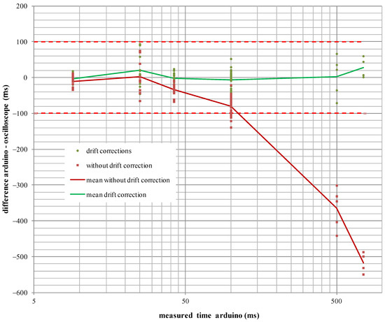 | Test Num. | Test Set | Measured Chanels | tm Arduino Measured Interval Time (ms) | tc Adjusted Using Equation (4) (ms) | t Oscilloscope (ms) | tm-t Difference without Adjustment (ms) | Relative Error without Adjustment (ppm) | Relative Error with Adjustment Equation (4) (ppm) |
