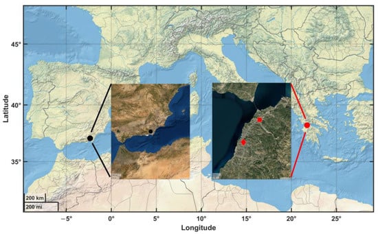 Map of the study sites at Almería, Spain (black circle) and Patras, Greece (red circle). The inset maps zoom in the Almería (PSA), Patras urban (Germanou, red diamond), and Patras background (UPat, red square) experimental sites.
