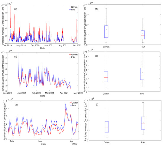 Daily Number Concentrations for particles 0.3–10 μm measured by Grimm and PAir in PSA (a), Germanou (c), and UPat (e). The right panel depicts the boxplots of daily average particle number concentrations in PSA (b), Germanou (d), and UPat (f). The black dots and the solid red lines correspond to the mean and median number concentrations. The bottom and top edges of the box indicate the 25th and 75th percentiles.