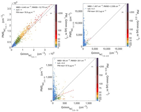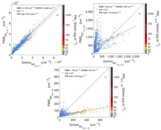 Scatterplots between PAir and Grimm number concentration measurements for particles with diameters 0.3–1 (a), 1–2.5 (b), and 2.5–10 μm (c) in UPat Background Site. The color bar shows the corresponding mass concentrations, PM1 (a), PM1–2.5 (b), and PM2.5–10 (c) as reported by Grimm. The 1:1 and the regression lines are also shown in black and red dotted line respectively.