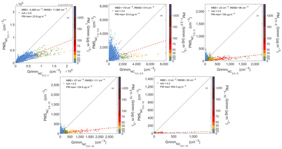 Scatterplots between PAir and Grimm number concentration measurements for particles with diameters 0.3–1 (a), 1–2.5 (b), 2.5–5 (c), 2.5–10 (d), and 5–10 μm (e) in PSA semi-arid area. The color bar shows the corresponding mass concentrations, PM1 (a), PM1–2.5 (b), PM2.5–5 (c), PM2.5–10 (d), and PM5–10 (e), as reported by Grimm. The 1:1 and the regression lines are also shown in black and red dotted line respectively.