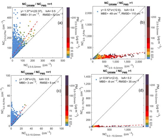 Scatterplots between PAir and Grimm number concentration measurements for particles with diameters 2.5–5 (a,b) and 5–10 μm (c,d) during the period when the fraction of Grimm measurements to PAir ones is lower than 1 (left panel) and higher than 1 (right panel) in the PSA semi-arid area. The color bar represents the corresponding mass concentrations PM2.5–5 (a,b) and PM5–10 (c,d), as reported by Grimm. The 1:1 and the regression lines are also shown in black and red dotted line respectively.