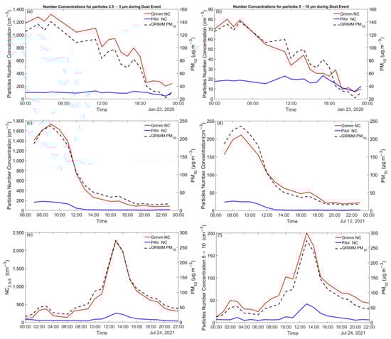 Daily PM10, NC2.5–5 (left panel), and NC5–10 (right panel) concentrations during dust events on 23 January 2020 (a,b), 12 July 2021 (c,d), and 24 July 2021 (e,f) in PSA as reported by Grimm (red and black dashed line) and Pair (blue line).
