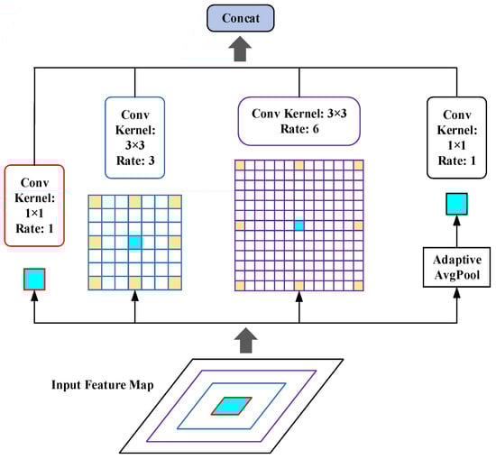 FPN reduces the number of channels of the feature map through a 1 × 1 convolution operation, which also suppresses the representation of multi-scale features, so we introduce ASPP to obtain multi-scale feature information. As shown in Figure 6, the four parallel branches of ASPP generate images of different scales through atrous convolution [34], using different atrous convolution rates and convolution kernels, where the convolution rates are 1, 3, and 6, respectively, and the convolution kernels sizes are 1 × 1 and 3 × 3, respectively. Using the ASPP module to improve the model’s performance in the fusion stage of each branch effectively expands the receptive field of feature images and improves the network’s ability to extract abstract information.