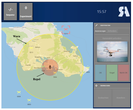 Participants performed an adapted version of a warship commander task (WCT [52]; adapted by Becker et al. [49]). The WCT is a quasi-realistic navy command and control task designed as a basic analogue to a Navy air warfare task [53]. It is suitable to investigate various cognitive processes of human decision-making and action execution [53]. Here, we used a non-military safety-critical task, where participants had to identify two different flying objects on a simulated radar screen around an airport. Objects included either registered drones (neutral, non-critical objects), or non-registered (critical) drones. They had to prevent the non-registered drones, potentially being a safety issue, from entering the airport’s airspace. Non-registered drones entering pre-defined ranges close to the airport had to be first warned and then repelled in the next step. A performance score was computed based on participants’ accuracy and reaction time. See Becker et al. [49], for a more detailed description of the scoring system, and see Figure 1 for an overview of the interface.