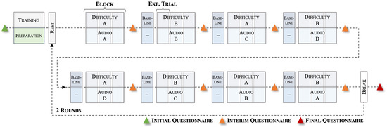 During the task, we presented vocal utterances, either spoken in a happy, angry, or neutral way from the Berlin Database of Emotional Speech (Emo-DB [50]). These utterances were combined into different audio files, each one minute long, with speakers and phrases randomly selected and as little repetition as possible within each file. We also included a control condition where no auditory distraction was presented. The task load was manipulated by implementing two difficulty levels in the WCT (low and high). This resulted in a 2 × 4 design with eight experimental conditions. Participants completed two rounds of all conditions in the experiment. Before the respective round, a resting state measurement was conducted (30 s). Each round then consisted of eight blocks, each comprising three 60-s trials of the same experimental condition. The task load condition (operationalised with the difficulty level) was alternated across blocks. Half of the subjects started with a high task load and the other half with a low task load block. Similarly, the concurrent emotional condition (operationalised with different auditory distractions) was randomised and sampled without replacement. Before each block, except for the first, participants completed a baseline condition trial with a very low difficulty level where they had to track six objects, of which three were non-registered drones. In the low task load condition, participants had to track 12 objects, of which six were non-registered drones. In the high task load condition, they had to track 36 objects, of which 17 were non-registered drones. We used different emotional audio files for the trials in one block. Before and after the whole experiment, as well as after each experimental block, participants filled in questionnaires. See Figure 2 for a schematic representation of the whole experimental procedure. Overall, the experiment lasted approximately 120 min, including 30 min of preparation time of the used measurement devices and calibration procedures.