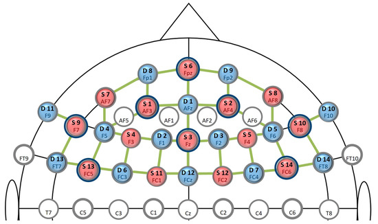 The ocular activity was recorded with the screen-based Tobii Pro Spectrum eye-tracking system, which provides gaze position and pupil dilation data at a sampling rate of 60 Hz. To capture changes in physiological responses, participants were wearing a Zephyr BioHarness™ 3 belt recording electrocardiographic (ECG), respiration, and temperature signals at a sampling rate of 1 Hz. Here, we used automatically computed, aggregated scores for the heart rate, heart rate variability, and respiration rate and amplitude from the device. Physiological as well as behavioural measures were recorded using the iMotions Biometric Research Platform software. Participants’ brain activity was recorded with a NIRx NIRSport2 system, which emits light at two wavelengths, 760 and 850 nm. Data were collected with the Aurora fNIRS recording software at a sampling rate of 5.8 Hz. To capture regions associated with mental effort, 14 source optodes and 14 detector optodes were placed over the prefrontal cortex [12,60] using the fNIRS Optodes’ Location Decider (fOLD) toolbox [61] (Figure 3, for the montage). Event triggers from the experimental task were sent to iMotions and Aurora using TCP protocols and Lab Streaming Layer (LSL). Signals from the different recording and presentation systems were temporally aligned offline after the data collection.