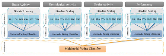 Not surprisingly, all these measures are, thus, often used as a stand-alone indicator for mental effort (i.e., in a unimodal approach). However, a multimodal approach has several advantages over using only one measure. It can compensate for specific weaknesses and profit from the strengths of the different complementary measurement methods (performance, subjective experience as well as neuro- and peripheral physiological measures) [25,26,27]. For instance, (neuro-)physiological measures can be obtained without imposing an additional task [16] and allow for capturing cognitive subprocesses involved in executing the primary task [28]. A multimodal approach, hence, provides a more comprehensive view of (neuro-)physiological processes related to mental effort [4,5,25,29], as it can capture both central and peripheral nervous system processes [21,27]. However, fusing data from different sources remains a major challenge for multimodal approaches. ML methods provide solutions to compare and combine data streams from different measurements. ML algorithms are becoming increasingly popular in computational neuroscience [30,31]. The rationale behind these algorithms is that the relationship between several input data streams and a particular outcome variable, e.g., mental effort, can be estimated from the data by iteratively fitting and adapting the respective models. This allows for data-driven analyses and provides ways to exploratorily identify patterns in the data that are informative [32].